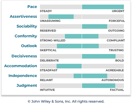 The Predictive Index assessment primarily focuses on behavioral traits, measuring five behavioral scales: dominance, extraversion, patience, formality, and objectivity. Candidates' results on these scales are categorized into one of 17 Reference Profile personality archetypes. This method provides a way to describe someone's general outlook.